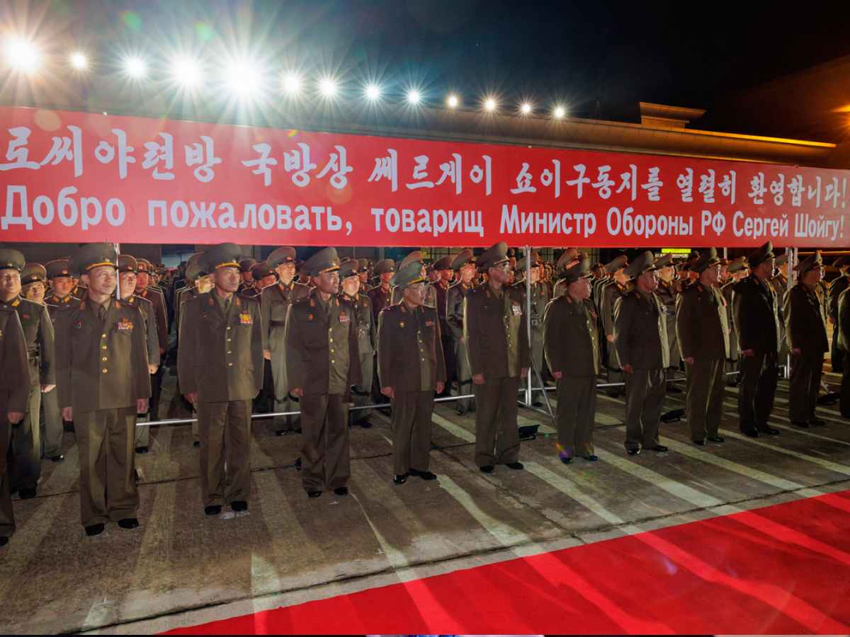 Crveni transparent sa natpisom "Dobro došli, druže ministre odbrane Ruske Federacije Sergej Šojgu!" na korejskom i ruskom stajao je iza niza vojnika koji su salutirali na aerodromu.